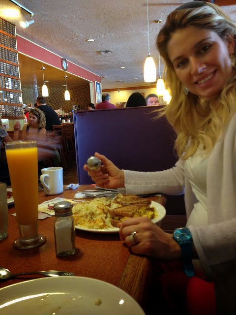 İlk haftalarda çılgın gibi kilo almamı sağlayan kahvaltılardan biri. "IHOP" restaurantındayız. Burda, pancake, hushbrown, kahve , daha birçokları... müthiş. Sanki Türkiye'de incecik gezen ben değilmişim gibi... Ne kadar kendimi tutsamda arada bir fire verdim. Sonrada boşver Tuba bir kere hamile kaliyorsun dedim. Pasta ve pancakelerden uzak durmaya çalışsam da bir şekilde kilo alıyorsun. Son ay kilolari diycem ama... bence Amerika'nın güzel yemek kilolari desek daha doğru olur.) Siz kilo istemem diyorsaniz, salata, protein, süt, yoğurt, meyve , sebzeye devam:)