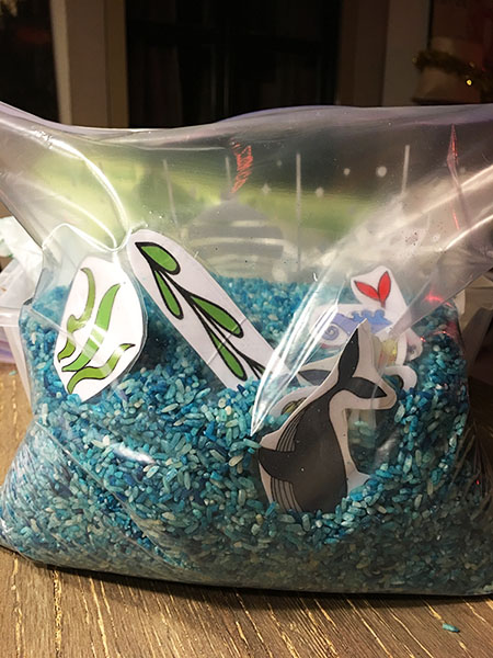 Pirinci nasıl renklendirirsin yazımda bulabilirsiniz. Pirinçler maviye boyandığında turkuaz rengini alıyor ve sanki okyanustaymış izlenimi veriyor. Pirinçleri renklendirdikten sonra geniş bir kutuya dökün. İçine de plastik balık, denizatı, ahtapot, bitkiler, denize dair ne bulursanız koyun. Ben kitaptan kestiğim bitki ve balıkları koydum sonrada onları plastik press yaptırdım ve onlarla oynadık.